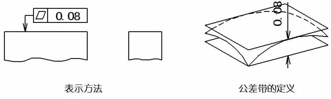 示例:公差帶是位于距離0.08mm的兩個平行平面之間的區域。