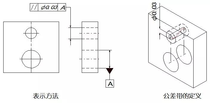 示例:如公差值前加注記號Φ、則公差帶為基準平行直徑Φ0.03mm的圓柱面內。