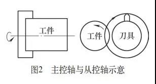 首先兩個(gè)主軸要分為主動(dòng)軸和從動(dòng)軸,成為同步標(biāo)準(zhǔn)的軸稱(chēng)作主動(dòng)軸,與主動(dòng)軸同步移動(dòng)的軸稱(chēng)為從動(dòng)軸。在多邊形加工中,刀具軸作為主動(dòng)軸,工件軸作為從動(dòng)軸(見(jiàn)圖2)。